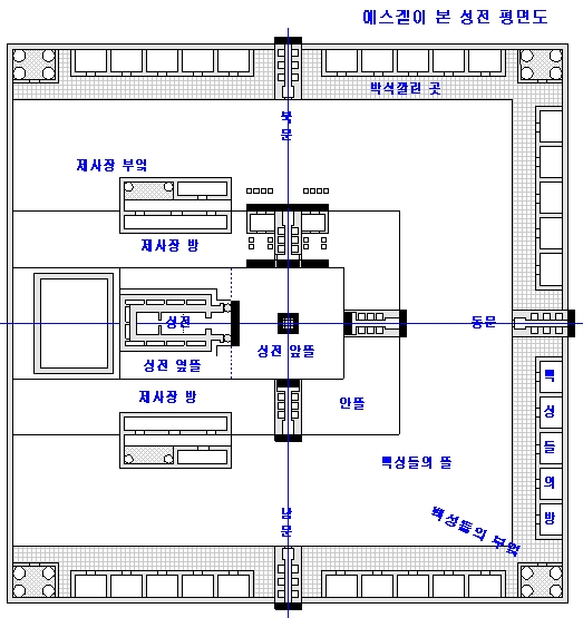 1 그(천사)가 나를 데리고 밖으로 나가 북쪽 뜰로 가서 두 방에 이르니 그 두 방의 하나는 골방 앞 뜰을 향하였고 다른 하나는 북쪽 건물을 향하였는데